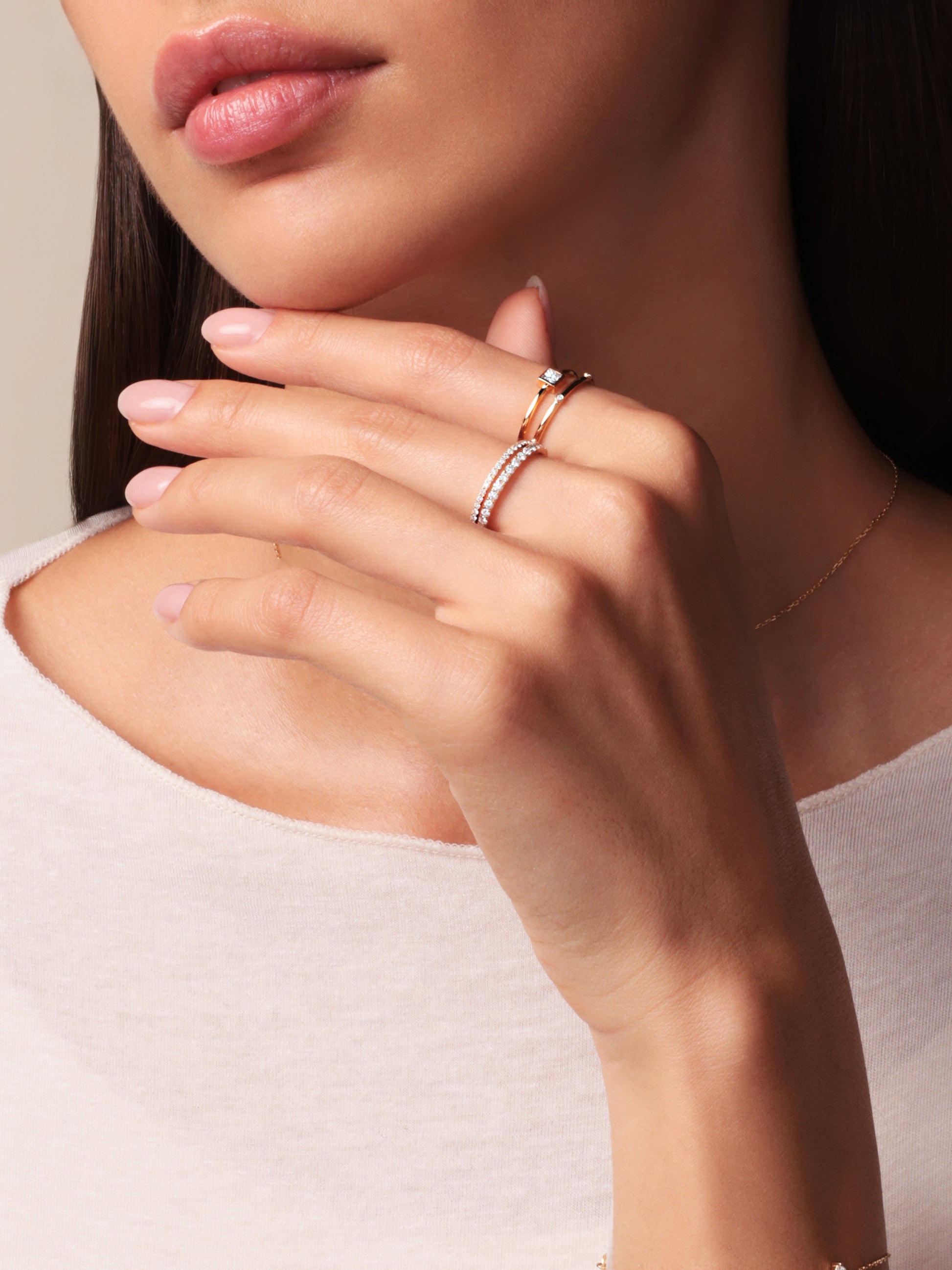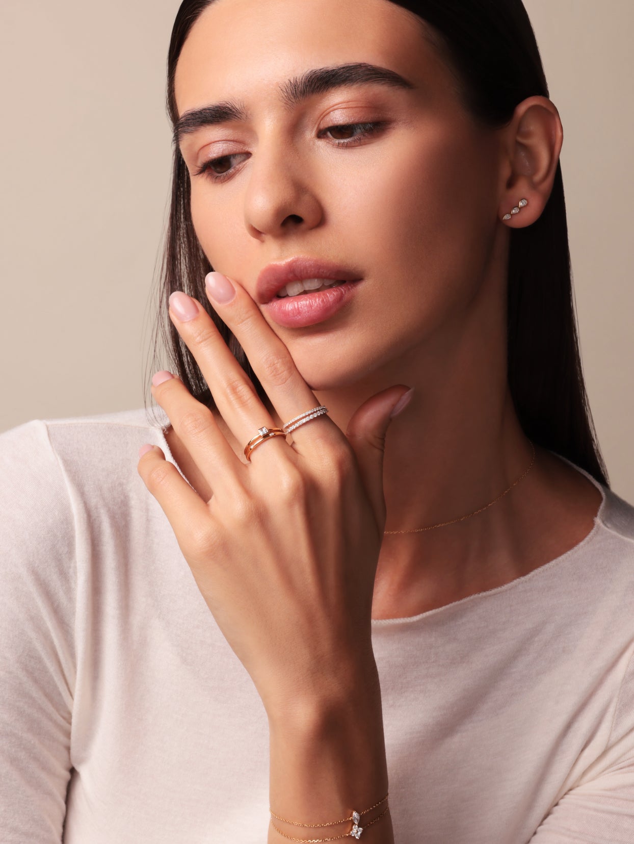 A symbol of timeless radiance, the Halo Ring is crafted in 18k gold and encircled with brilliant pavé-set diamonds that create a seamless band of light. Available in two versions, Halo and Halo Bold, the design offers a choice between subtle shimmer or a more pronounced brilliance, with the Bold featuring larger diamonds for an elevated statement. Effortlessly versatile, it embodies Solara’s refined approach to everyday luxury.