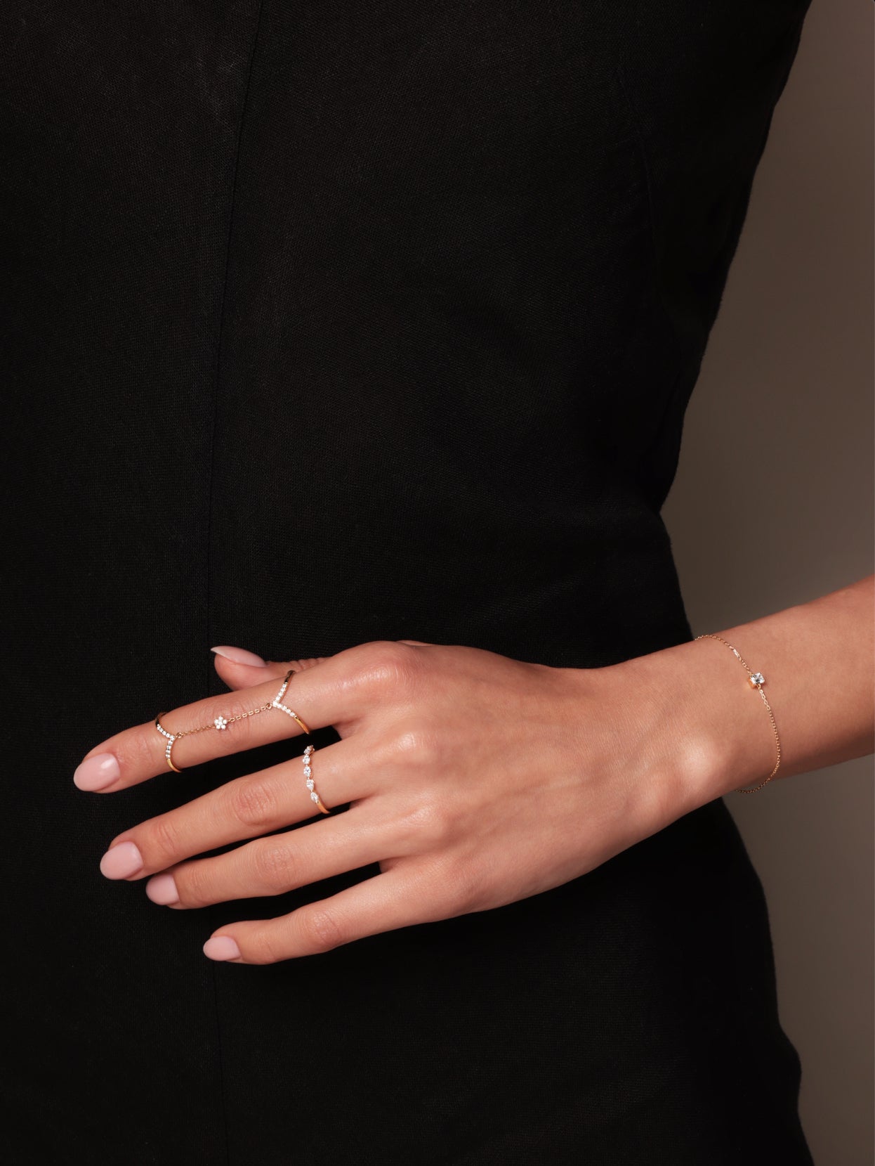 Timeless brilliance meets modern simplicity in the Vega Ring. Crafted from 18k gold, it features a sleek band adorned with a linear arrangement of brilliant-cut diamonds each meticulously set to create a seamless, luminous flow. Designed for effortless elegance, the Vega embodies refined minimalism and can be worn alone or stacked for a contemporary statement.